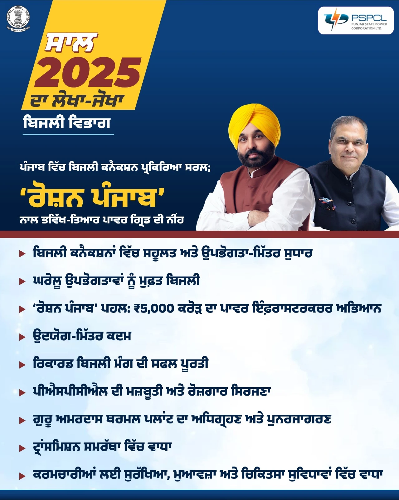 ਸਾਲ 2025 ਦਾ ਲੇਖਾ ਜੋਖਾ-ਬਿਜਲੀ ਵਿਭਾਗ- ਪੰਜਾਬ 'ਚ ਬਿਜਲੀ ਕਨੈਕਸ਼ਨ ਪ੍ਰਕਿਰਿਆ ਸਰਲ; ‘ਰੋਸ਼ਨ ਪੰਜਾਬ’ ਨਾਲ ਭਵਿੱਖ-ਤਿਆਰ ਪਾਵਰ ਗ੍ਰਿਡ ਦੀ ਨੀਂਹ