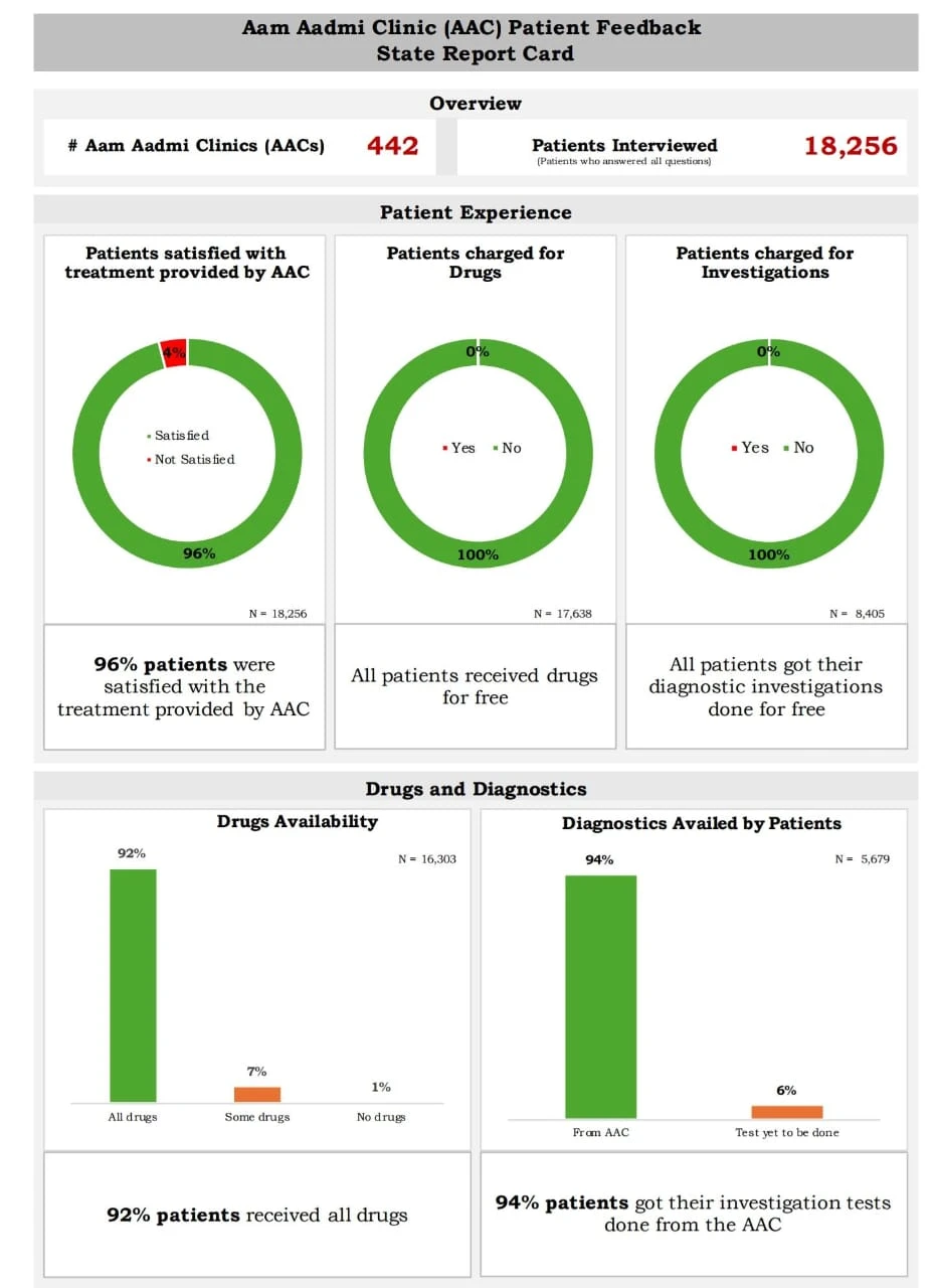 ਸੂਬੇ ਭਰ ਦੇ 18,256 ਮਰੀਜ਼ਾਂ ਨਾਲ ਕੀਤੀ ਗੱਲਬਾਤ ਦੇ ਆਧਾਰ 'ਤੇ, ਤਿਆਰ ਕੀਤੇ ਮਰੀਜ਼ ਫੀਡਬੈਕ ਸਟੇਟ ਰਿਪੋਰਟ ਕਾਰਡ ਅਨੁਸਾਰ, 96 ਫੀਸਦ ਮਰੀਜ਼ਾਂ ਨੇ ਆਮ ਆਦਮੀ ਕਲੀਨਿਕਾਂ ਵਿੱਚ ਦਿੱਤੇ ਜਾਣ ਵਾਲੇ ਇਲਾਜ 'ਤੇ ਸੰਤੁਸ਼ਟੀ ਪ੍ਰਗਟਾਈ। ਰਿਪੋਰਟ ਇਹ ਸਪਸ਼ਟ ਕਰਦੀ ਹੈ ਕਿ ਪੰਜਾਬ ਵਿੱਚ ਮੁੱਢਲੀ ਸਿਹਤ ਸੰਭਾਲ ਹੁਣ ਪੂਰੀ ਤਰਾਂ ਬਦਲ ਚੁੱਕੀ ਹੈI ਹੁਣ ਇਹ ਪ੍ਰਣਾਲੀ ਊਣਤਾਈਆਂ ਅਤੇ ਅਣਗਹਿਲੀਆਂ ਦੀ ਥਾਂ ਭਰੋਸੇਯੋਗਤਾ, ਮਿਆਰੀ ਅਤੇ ਭਰੋਸੇ ਵਿਚ ਤਬਦੀਲ ਹੋ ਗਈ ਹੈ ਅਤੇ ਨਾਗਰਿਕਾਂ ਨੂੰ ਬਿਨਾਂ ਕਿਸੇ ਵਿੱਤੀ ਬੋਝ ਦੇ ਸਮੇਂ ਸਿਰ ਡਾਕਟਰੀ ਸਹਾਇਤਾ ਮਿਲ ਰਹੀ ਹੈ।